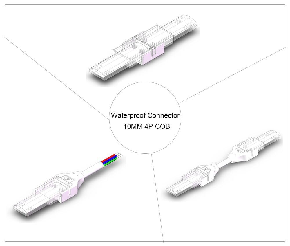 | 89# HR-IP-COB-4PIN-10MM-B | Strip to Wire | 10mm PCB; Squared encapsulated extruded deimension 12x4mm | 3-240V/6A | 34.5x17x8.5mm | Nylon, PC | 180MM Length 20AWG/0.52mm² | White&Transparent |